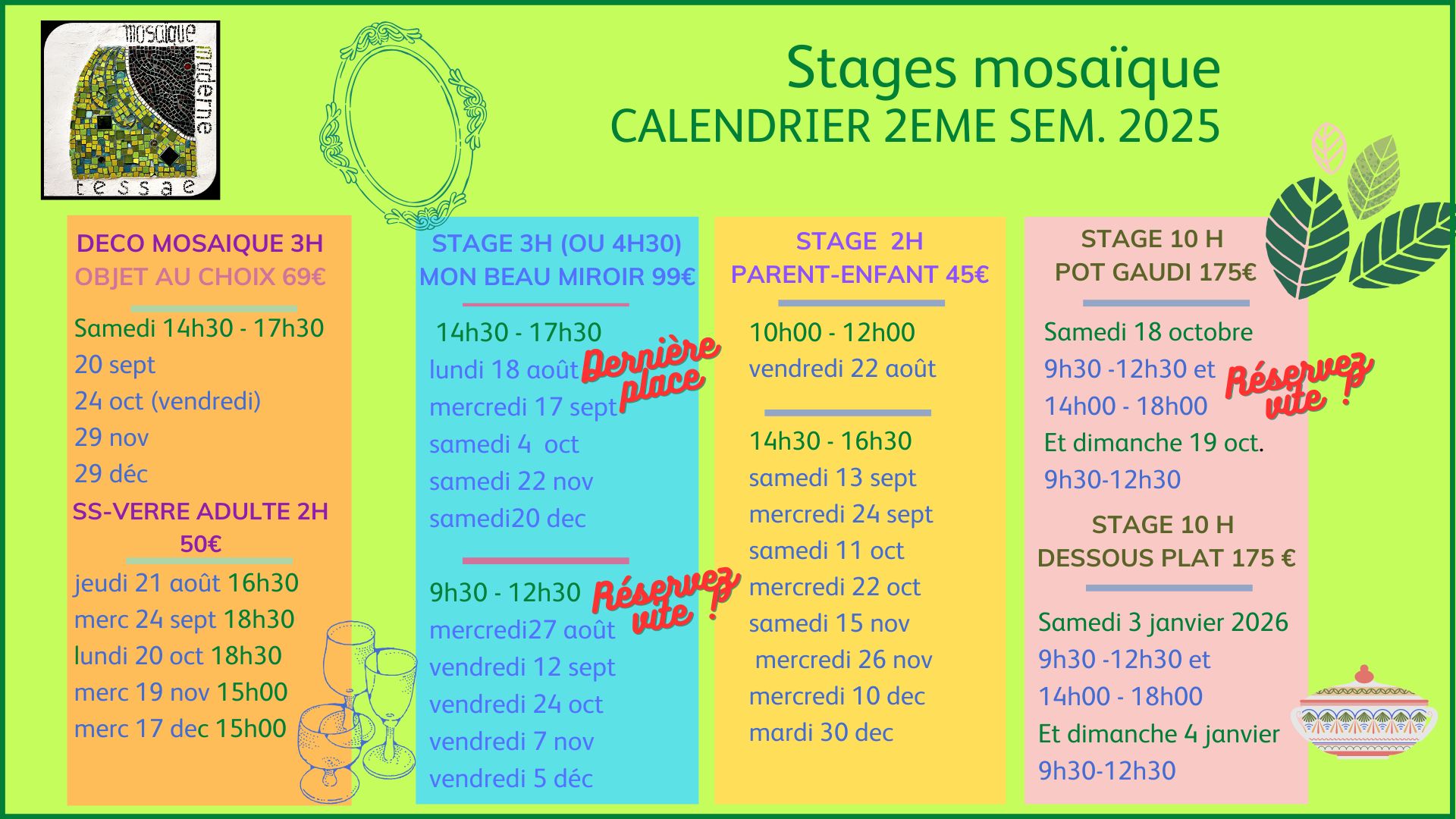 En petit groupe de 2 à 6 personnes, dès 12 ans, et sans limite d’âge, venez découvrir la mosaïque ou perfectionner votre technique à travers différents stages thématiques. Des modèles variés permettent d’adapter le stage à votre niveau. Un choix de matériaux et de modèles est à votre disposition pour une création personnelle ! Il n’est pas indispensable de savoir dessiner.